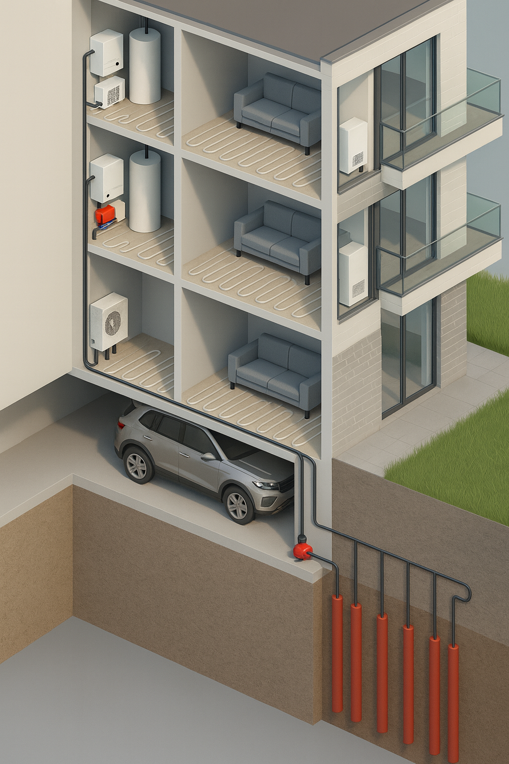 De warmtepomp zet deze duurzame energie om in comfortabele verwarming, koeling en warm water. In combinatie met passieve koeling en verwarming via geothermie blijft het binnenklimaat aangenaam, met een zeer laag energieverbruik en minimale onderhoudskosten.